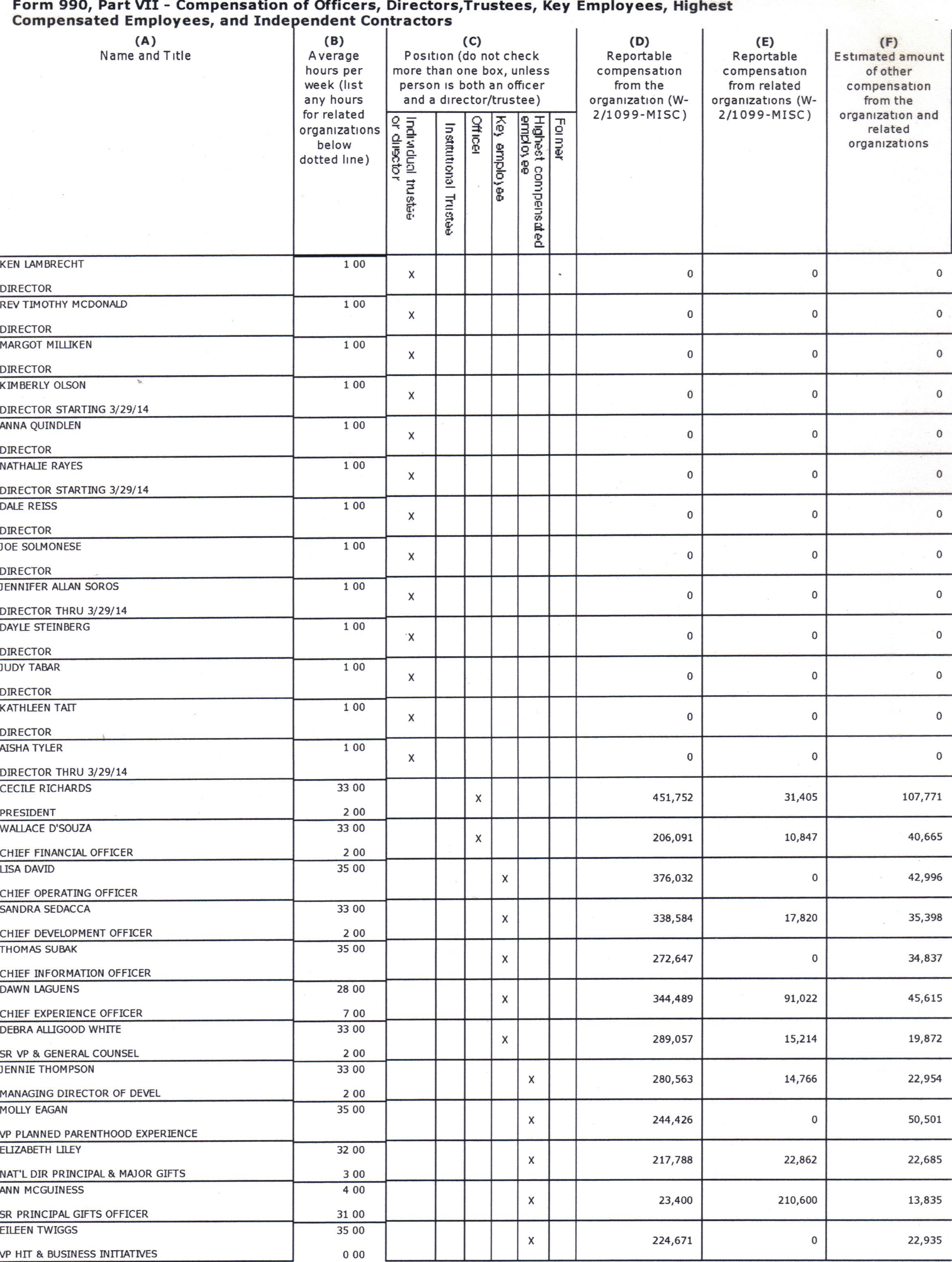 Cecile received some $591,000 working for her non-profit in 2013, according to IRS records. A host of other folks also saw $200,000 or more in their pockets that year from the parenthood group – see above. But money is only part of the story of Cecile.
