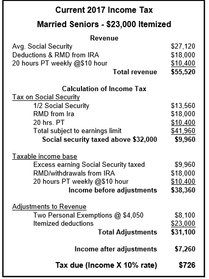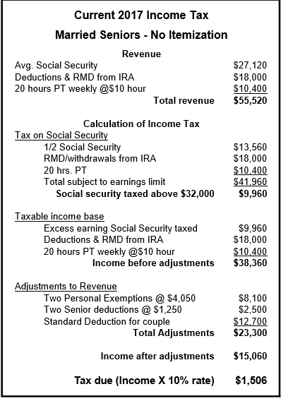 The table below shows the current income tax formula for a senior couple with the average Social Security benefit, plus a part-time job, and an RMD. (At age 70 1/2 the government forces you to take out part of your IRA and pay income tax on it every year. If you have stocks or bonds, they must be sold to satisfy the IRS, even if they lost value.)