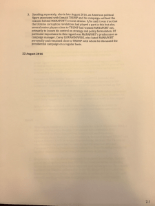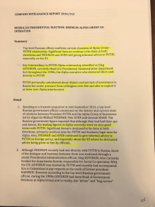 Enhanced images of the PDFs obtained from the Buzzfeed site, which published the RUDO, also known as the Steele Dossier, indicate the same back light shadow on all the dossier pages. This shadow was not seen on the original documents, but by converting to JPG format and auto correcting, the same marking appeared on every page, meaning they were all photographed in an amateur manner at the same time.