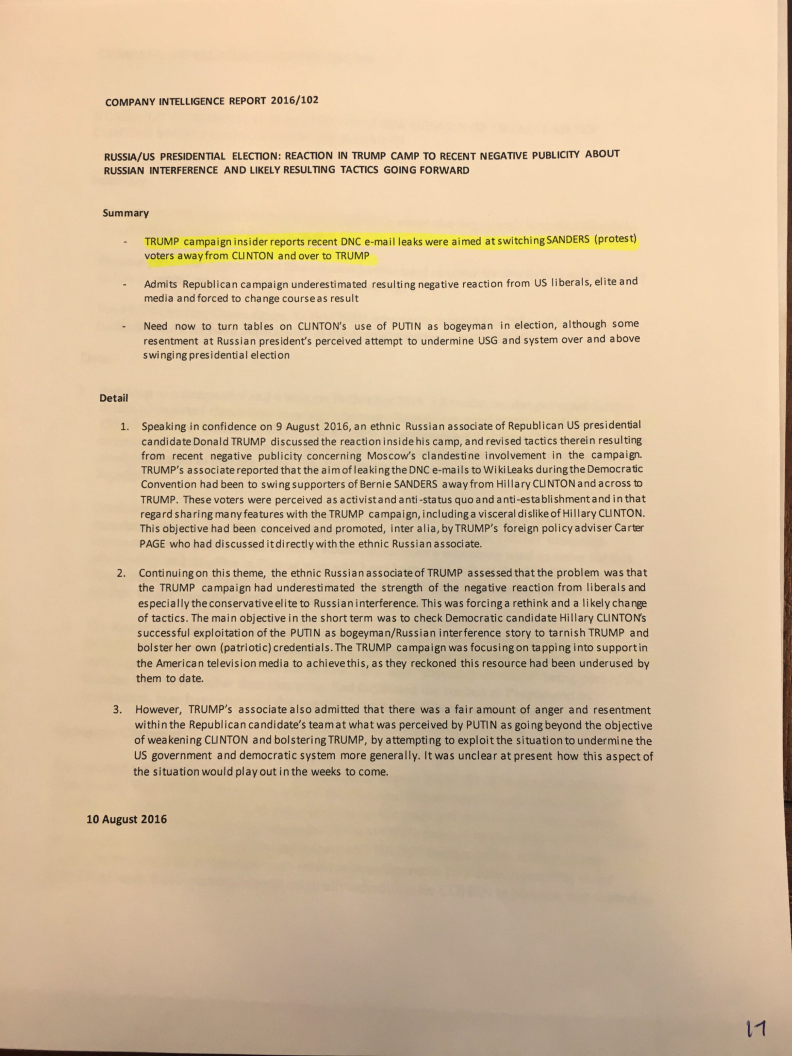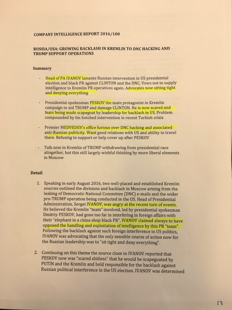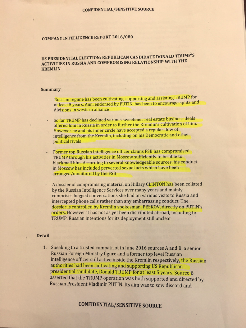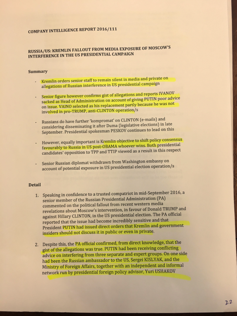 Buzzfeed found that dossier’s errors emerged almost immediately … complete with idiocies like yellow highlighting and many last names in All Caps.