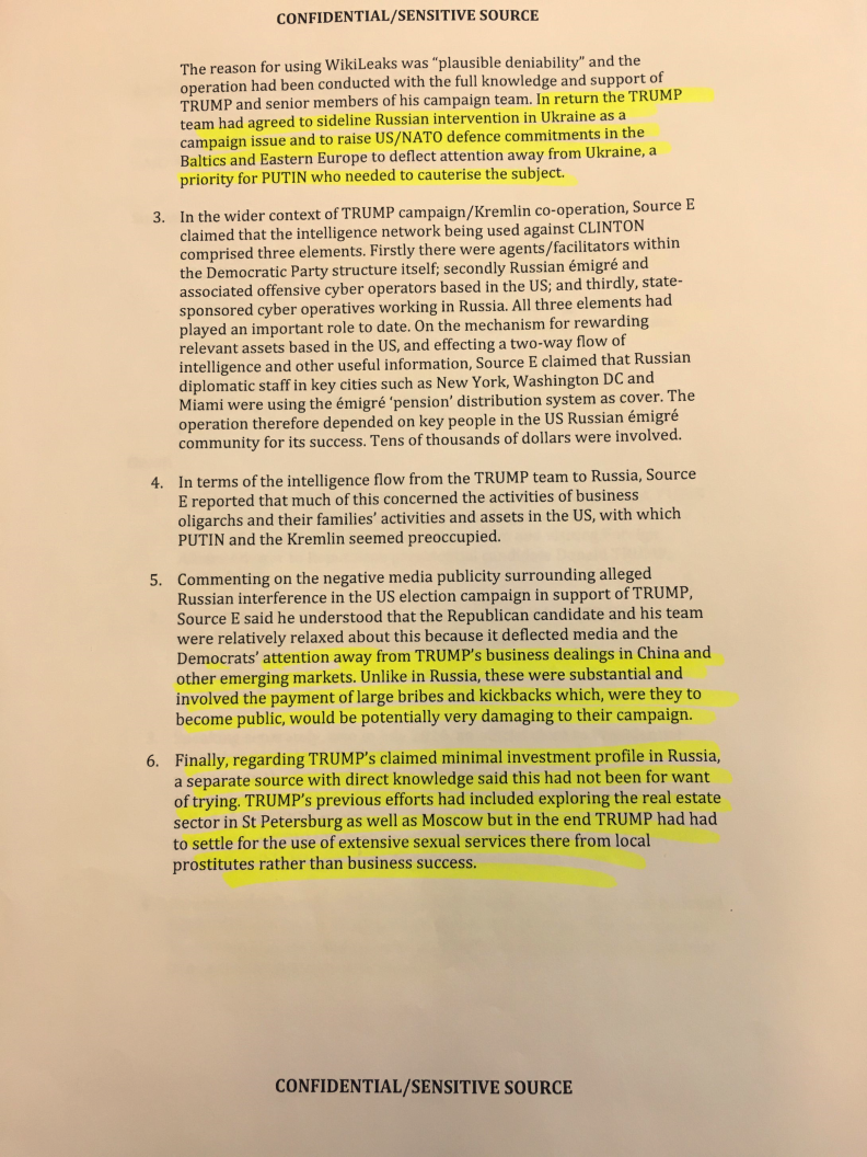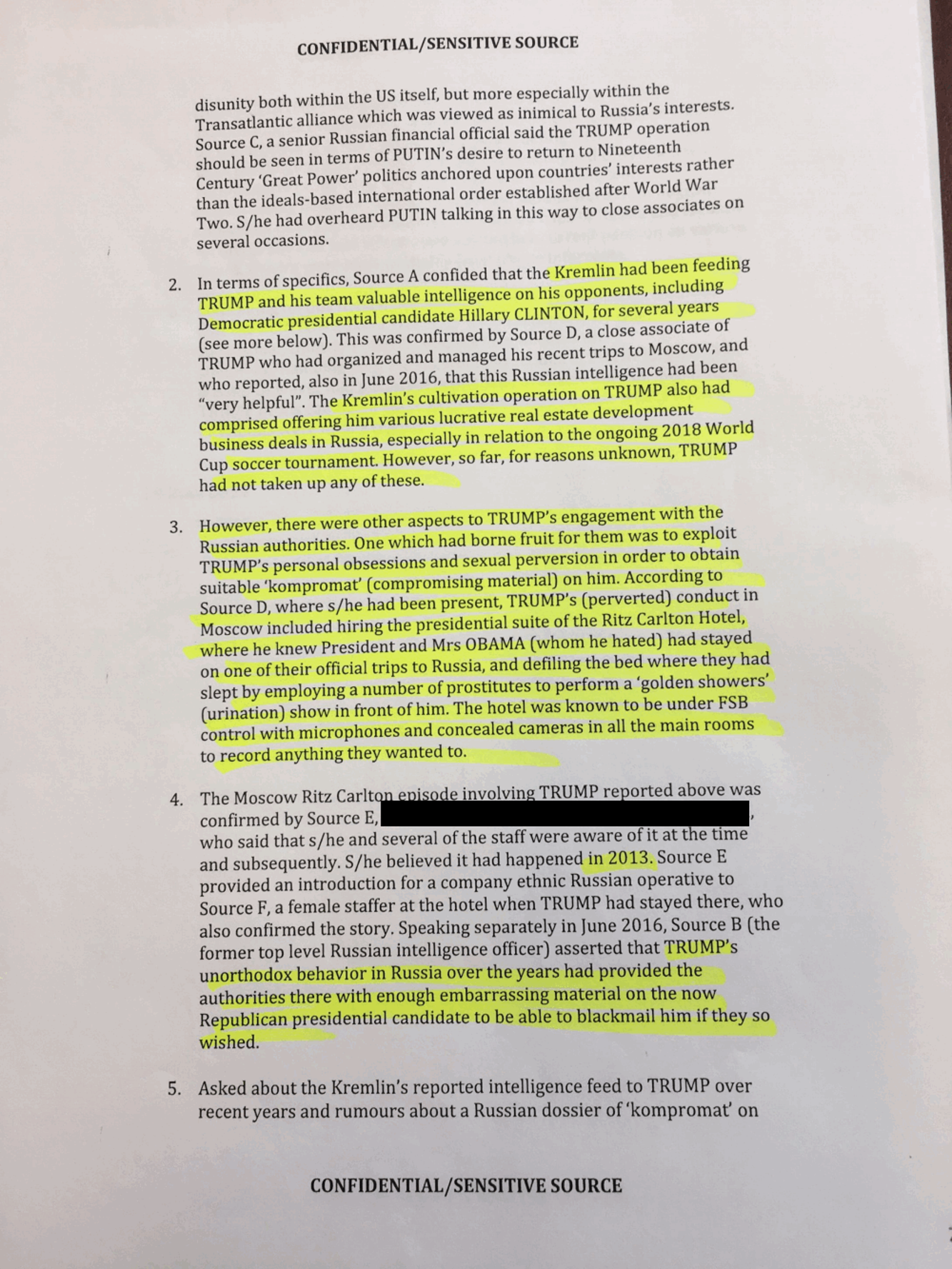 The dossier – first referred to publicly by CNN – was not available on their website, but viewers were conveniently told it was posted on Buzzfeed.com (still available by PDF and text transcript by going to this link). Warning: Mature content and disgusting descriptions.