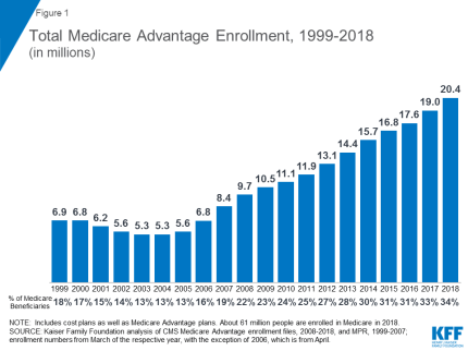 As a result of intentional policies to privatize senior healthcare, the growth of Medicare Advantage plans has continued – with more than one in three retirees now enrolled: