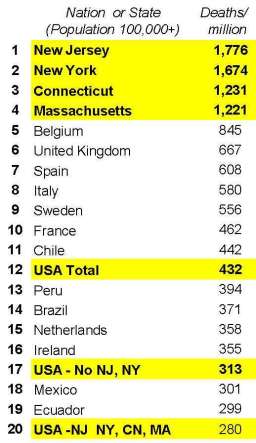 Even worse, if New York State has the second most deaths per million residents in the world – 1,674 – almost twice the first place country, Belgium (845). Adjacent New Jersey was the worst – 1,776.