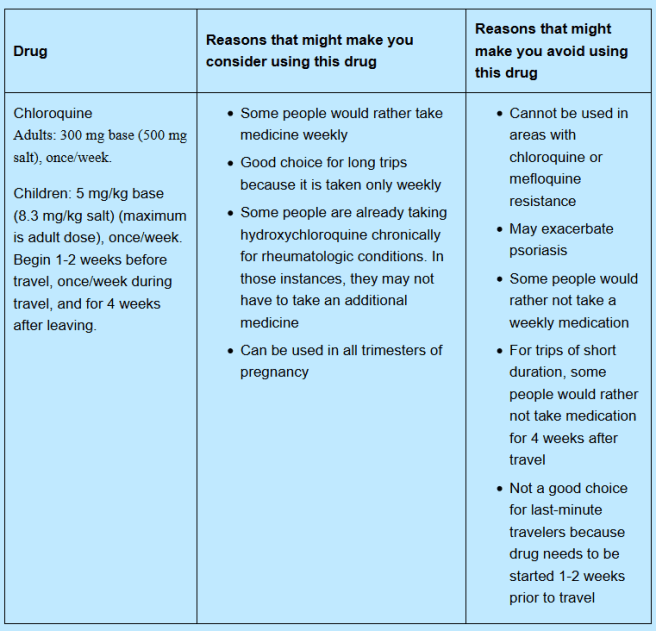 Both adults and children should take one dose of chloroquine per week starting at least 1 week before traveling to the area (Africa) where malaria transmission occurs. They should take one dose per week while there, and for 4 consecutive weeks after leaving. The weekly dosage for adults is 300mg base (500mg salt). – Centers for Disease Control and Prevention (CDC)