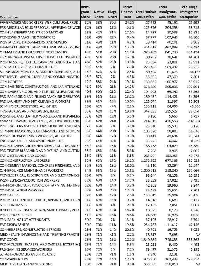 In high-immigrant occupations, 54 percent of American citizens in those jobs are high school grads with no college or tech training. CIS said Americans “tend to have high unemployment (1.8 million!) in high-immigrant occupations, averaging 9.8 percent.”