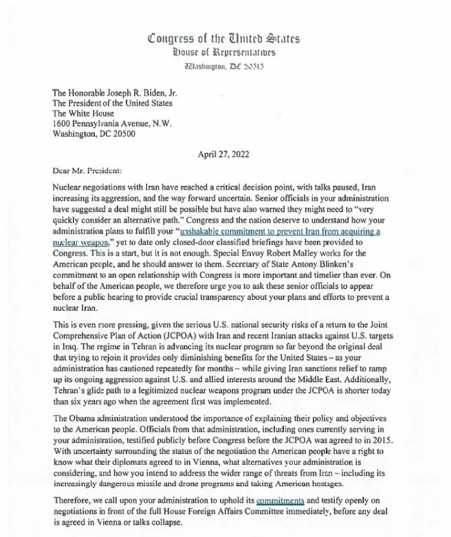 With uncertainty surrounding the status of the negotiation, the American people have a right to know what their diplomats agreed to in Vienna, what alternatives your administration is considering, and how you intend to address the wider range of threats from Iran—including its increasingly dangerous missile and drone programs and taking American hostages.